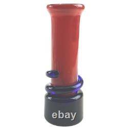 A good quality vintage art deco design studio art glass tango Vase C. An unusual and well made good quality vintage art deco design studio art glass Vase in the style of a'tango Vase', having a red glass column and blue glass chunky base with blue trailing snaking around. A heavy Vase very well made. 7.5 inches (19cm) height X 2.5 inches (6.5cm) dia approx.