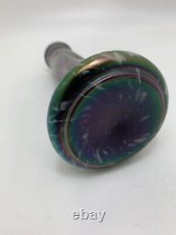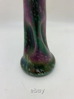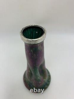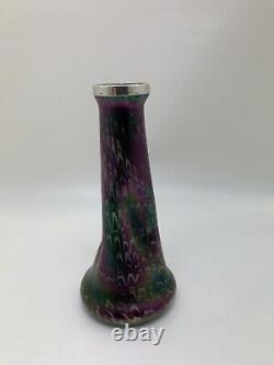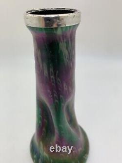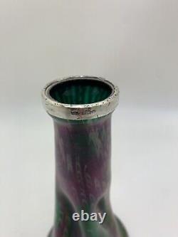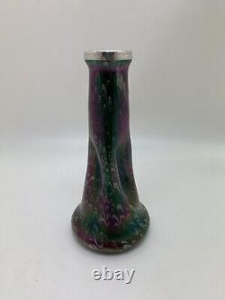 This medium-sized Art Nouveau vase by Josef Rindskopf features a Bohemian hand-blown glass design with a stunning iridescent silver rim. The vase showcases a multicolored floral pattern and embodies the Edwardian era's artistic style, making it a rare and exquisite piece of decorative art. Standing at 18cm in height and 8.7cm in width, this original antique Rindskopf vase is a handmade masterpiece that reflects the elegance and craftsmanship of the early 20th century.