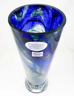 Makora Krosno Pologne Vase en Verre Artisanal Cobalt Bleu Tourbillonnant. Apportez une touche d'élégance artistique à votre espace avec ce magnifique vase en verre. La silhouette élégante de ce vase présente des tons de bijoux riches accentués par des filaments légers d'orange rappelant les profondeurs tourbillonnantes de l'océan. Fabriqué à la main en Pologne, ce chef-d'œuvre a une profondeur visuelle qui rafraîchira n'importe quel décor intérieur. Ce vase est en excellent état sans fissures ni éclats.