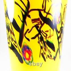 Vase en verre art avec design Millefiori éclaboussure jaune de style Murano soufflé à la main de 12,25 pouces de hauteur. Une belle pièce qui exprime la créativité et l'élégance simple. Des coups de pinceau avec des fleurs rouges et bleues mettent en valeur une expression artistique stylisée sur ce vase en verre coloré. Fabriqué à la main en utilisant des techniques de soufflage de verre, ce vase a un design moderne et des motifs complexes qui égayeront n'importe quel espace. Ajoutez une touche de couleur à votre décoration intérieure avec ce vase en verre unique.
