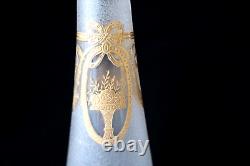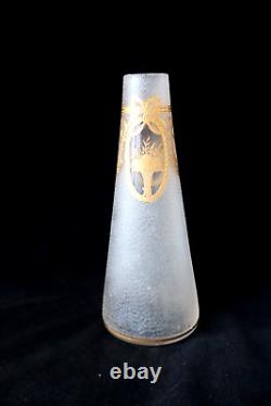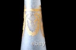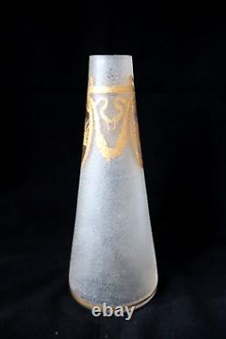Vase en verre camée vraiment élégant des Cristalleries de Saint Louis du 19ème siècle, datant d'environ 1900. Grand vase en forme conique avec décor en verre givré (camée), orné de nœuds dorés gravés, de guirlandes et de médaillons de paniers floraux. Excellent état, un peu de résidu à l'intérieur. Diamètre de la base 7 cm.