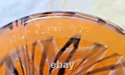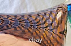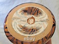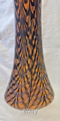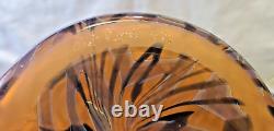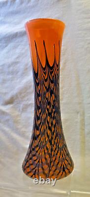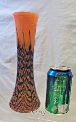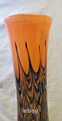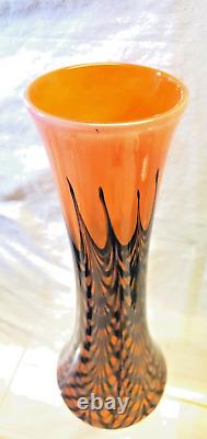 Vase en verre artistique signé. Verre soufflé à la main orange avec un design de plumes noires tirées et de toiles d'araignée. Excellent état, sans défauts détectés ni preuve d'une utilisation antérieure.